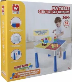Découvre la table d’activités et de construction 2 en 1, pour stimuler la créativité et l’imagination de bébé. Une hauteur ajustable grâce aux pieds réglables, pour permettre à bébé de jouer assis ou debout. Sur le recto de la table, il pourra créer son univers avec les briques Wise Block Junior incluses (. Contient 1 bac de rangement et 55 pièces. Compatible avec les briques de grande marque. Hauteur ajustable.) et découvrir les briques colorés et de différentes formes. Coté verso, un plateau lisse pour permettre à bébé de faire des dessins. Pratique : le bac de rangement permet de ranger toutes les briques Wise Block Junior ainsi que ses accessoires ! Table compatibles avec les briques Wise Block Junior et briques de grandes marques.