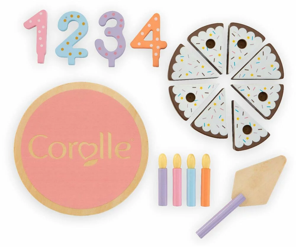 Le Gâteau Anniversaire Bois est parfait pour fêter l’anniversaire de son grand poupon de 36 ou 42 cm. Il comprend 18 accessoires : huit parts de gâteau avec bandes auto-agrippantes prêtes à être servies; quatre chiffres (1;2;3 et 4); quatre bougies; une pelle à gâteau et un plateau.