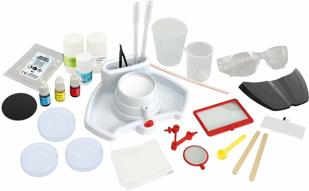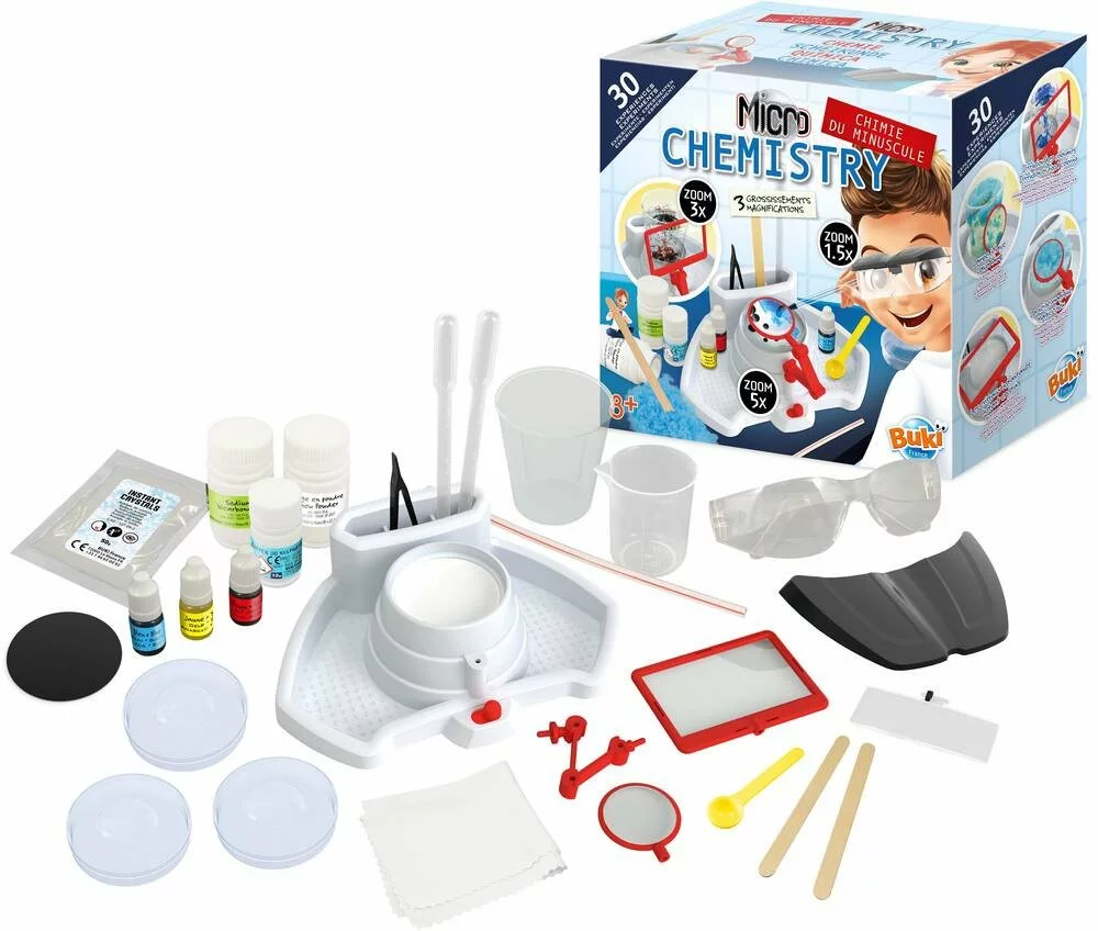 30 expériences pour se plonger dans le monde incroyable du minuscule Le coffret contient des lunettes grossissantes (x1,5) et une station éclairée avec une loupe sur bras articulé (x3) et une large loupe (x5) Nombreux accessoires inclus: pipettes, seringue, pince, aiguille, boîtes de Petri, réactifs (colorants, poudre à cristaux.)