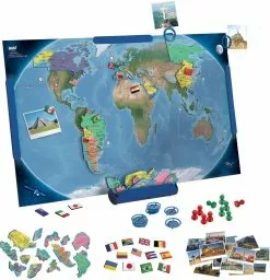 Planisphère pour découvrir les pays du monde entier ! Place les 40 pièces de puzzle et 50 drapeaux aimantés. 20 vignettes incluses.