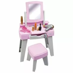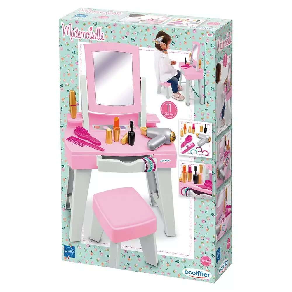 Avec miroir et tabouret. Range les accessoires inclus (peigne, brosse, bracelets, maquillage…) !
