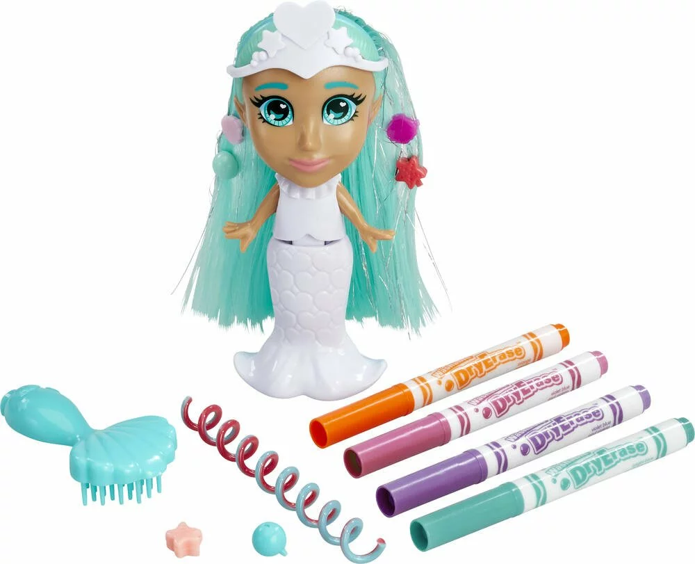 Personnalise ta poupée et ses cheveux grâce aux feutres effaçables et aux nombreux autres accessoires inclus.