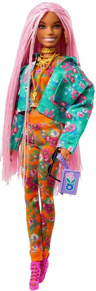Barbie (11 points d’articulation) a choisi la couleur rose pour ses cheveux tressés, elle est associée à une souris DJ et des accessoires de mode.