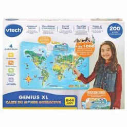 Un planisphère interactif et tactile pour explorer le monde ! • Un planisphère coloré et riche pour découvrir plus de 1 000 informations sur la géographie, les continents, les pays, les animaux, les monuments, les océans et bien plus encore. • Plus de 200 points d’interactions sur la carte. • De nombreuses illustrations pour documenter le jeu et les apprentissages. • 4 modes de jeu : – Exploration : jeu libre pour explorer l’ensemble des points disponibles sur la carte. – Course autour du monde : pour retrouver les pays du planisphère le plus rapidement possible. – Animaux : pour retrouver les animaux en fonction de leurs caractéristiques. – Monuments : pour retrouver les monuments célèbres qui se trouvent sur la carte. • À poser au sol ou à accrocher au mur. • Dimensions : 80x39cm. • Réglage du volume sonore et arrêt automatique.