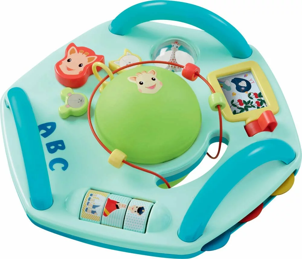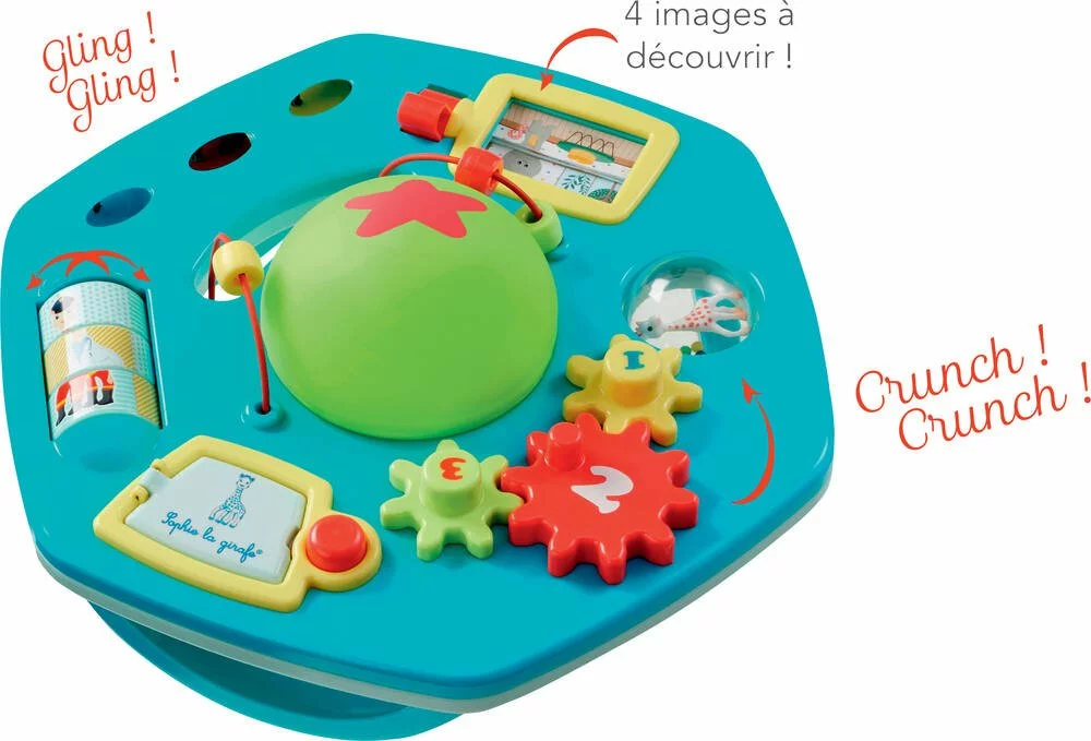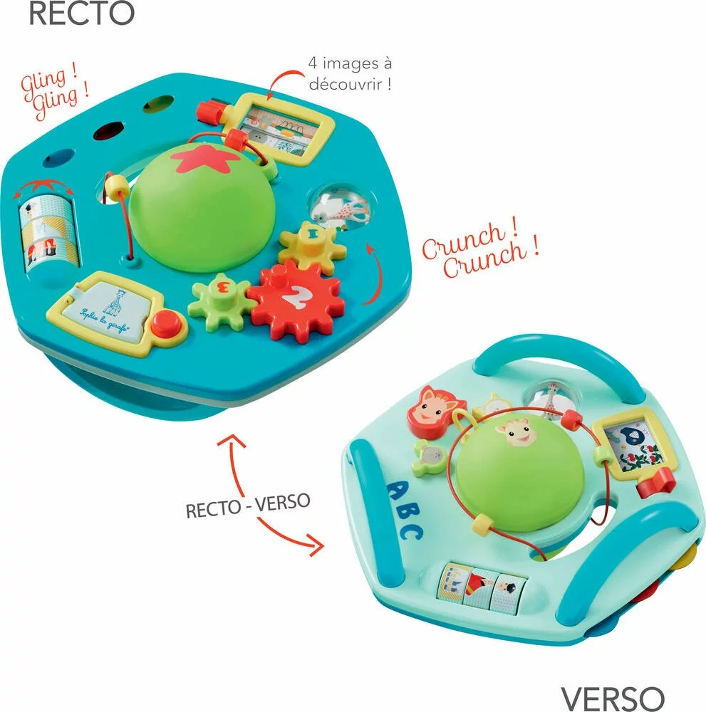 Un tableau d’activités recto verso à 360 pour encore plus de jouabilité Evolutif, il offre plusieurs positions de jeux à plat ventre, assis, à quatre pattes Une vraie innovation Une fois retourné, grâce à sa balle souple et ses poignées, le plateau devient un espace de motricité et offre une multitude de façons de jouer Nombreuses activités pour éveiller les sens de bébé et développer sa motricité. Une Balle amovible avec des grelots à l’intérieur, un incontournable de l’éveil à agiter, à faire rebondir ou à lancer. Des engrenages à faire tourner pour entendre un bruit de crécelle Malin Sur le verso du tableau, les engrenages sont remplacés par Sophie et ses amis, à qui on fait tourner la tête. 3 parcours de billes, dont 1 traversant pour développer la motricité fine de bébé. Un miroir surprise caché derrière une porte “pop up” qui s’ouvre quand on appui sur le bouton. 4 images à découvrir en actionnant la manette Bébé découvre les animaux de compagnie et leur nourriture préféré. Un puzzle adapté aux tout petits 3 images à reconstituer pour apprendre les différents métiers Rigolo, avec la fonction Mix’n’Match bébé crée des nouvelles images et développe son imagination et gagne à tous les coups. Une balle transparente avec des billes à faire tourner. 3 cymbales pour les premiers concerts de musique Grâce à sa conception unique, Vice Versa offre à bébé des heures d’amusement Facile à transporter grâce à ses poignées pour accompagner bébé dans tous ses déplacements.